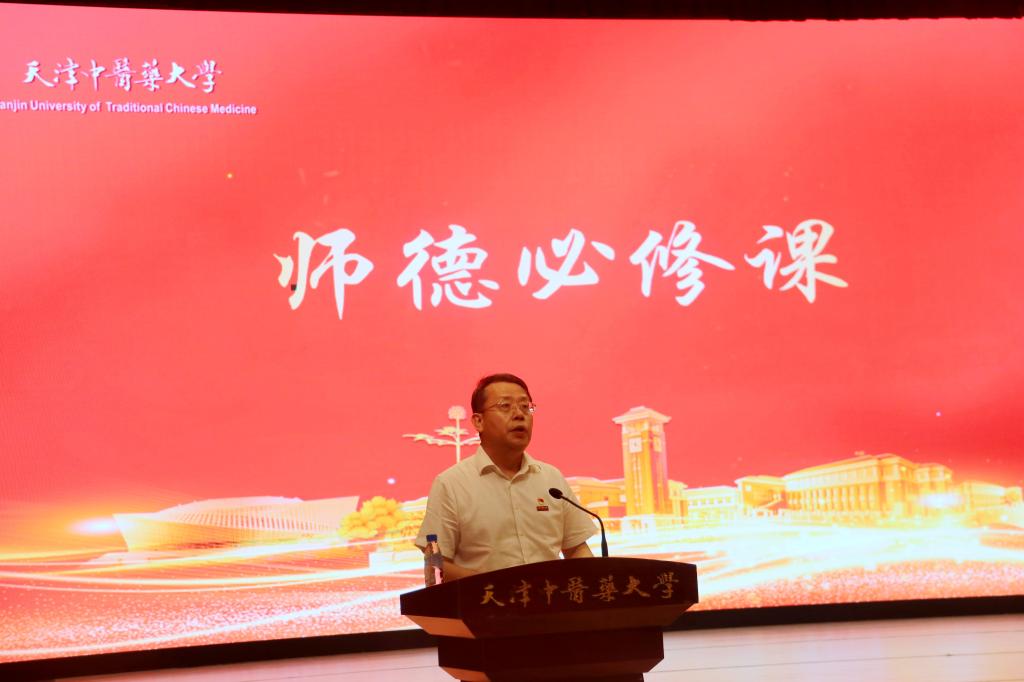 “人民英雄”国家荣誉称号获得者、国医大师、名誉校长张伯礼院士在发言中寄语教师们,“好老师不是天生的,而是在教学管理实践中、在教育改革发展中锻炼成长起来的”。希望大家牢固树立中国特色社会主义理想信念,带头践行社会主义核心价值观,自觉增强立德树人、教书育人的荣誉感和责任感,学为人师,行为世范,做学生健康成长的指导者和引路人;牢固树立终身学习理念,加强学习,拓宽视野,更新知识,不断提高业务能力和教育教学质量,努力成为业务精湛、学生喜爱的高素质教师;在教育教学中深入阐释“生命至上,举国同心,舍生忘死,尊重科学,命运与共”的伟大抗疫精神,诠释举国同心的制度优势、中西并重的学术优势,在潜移默化、润物无声中,培育学生的理想信念、家国情怀、社会责任、医者之风。
