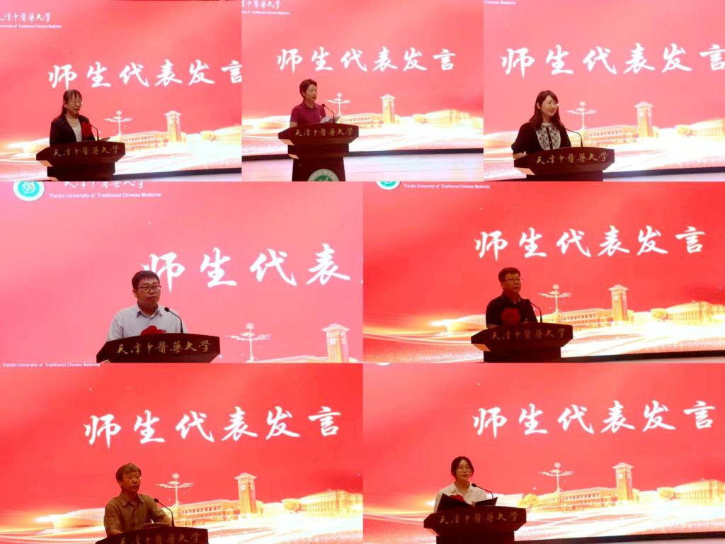 会上,第二批“全国高校黄大年式教师团队”获奖团队代表、中医药研究院党委书记王怡,党内外人才代表、第一附属医院急症部主任李桂伟和中医药研究院研究员于海洋,临床教师代表、第二附属医院肾病风湿科主任付滨,第二届筑梦班学员、文化与健康传播学院教师白迪迪分别作了大会发言,他们分享了各自教师生涯中的收获与感悟,表示将珍惜时光、为教育事业继续奋斗。荣休教师代表、原中药学院教师赵骏发言说,在天中医的38年里她爱教学、爱学生、爱学校,能以教师为职业,今生无悔。2020级涉外护理英语1班黄鹂鸣柳作为学生代表发言,表达了对老师的感恩之情。