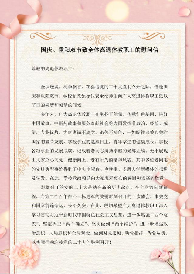 金秋送爽,桃李飘香,在喜迎党的二十大胜利召开之际,恰逢国庆和重阳双节。学校党政领导代表全校师生向广大离退休教职工致以节日的祝贺和诚挚的问候!