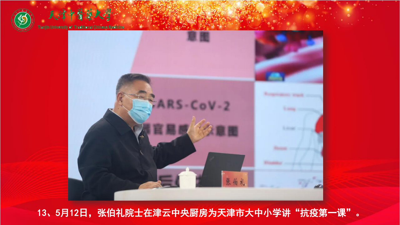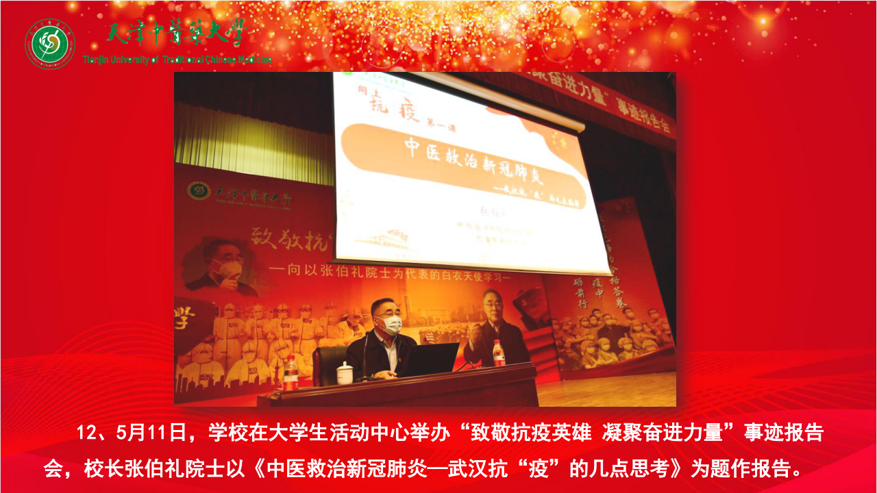 12、5月11日,学校在大学生活动中心举办“致敬抗疫英雄 凝聚奋进力量”事迹报告会,校长张伯礼院士以《中医救治新冠肺炎—武汉抗“疫”的几点思考》为题作报告。