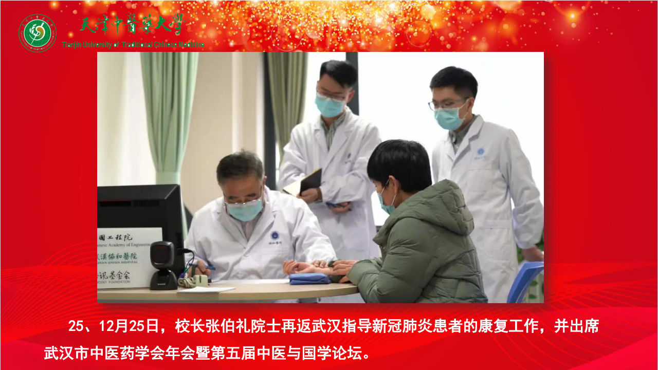 25、12月25日,校长张伯礼院士再返武汉指导新冠肺炎患者的康复工作,并出席武汉市中医药学会年会暨第五届中医与国学论坛。