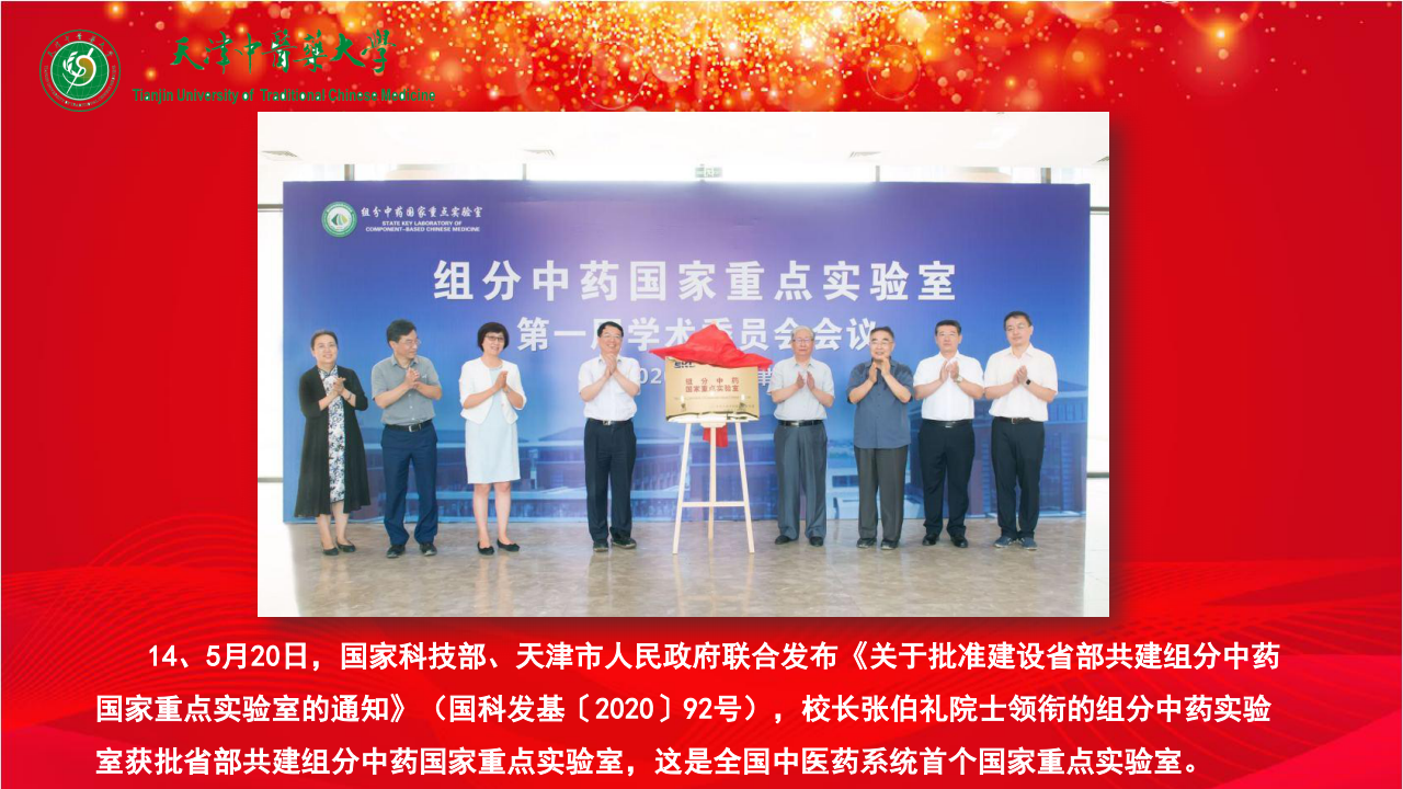 14、5月20日,国家科技部、天津市人民政府联合发布《关于批准建设省部共建组分中药国家重点实验室的通知》(国科发基〔2020〕92号),校长张伯礼院士领衔的组分中药实验室获批省部共建组分中药国家重点实验室,这是全国中医药系统首个国家重点实验室。