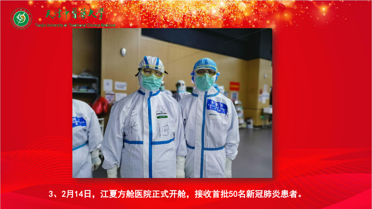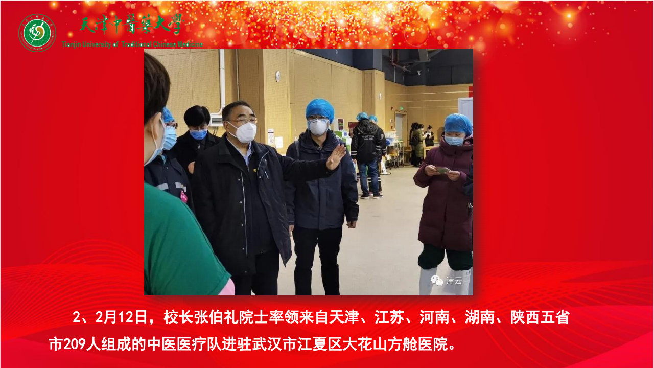 2、2月12日,校长张伯礼院士率领来自天津、江苏、河南、湖南、陕西五省市209人组成的中医医疗队进驻武汉市江夏区大花山方舱医院。