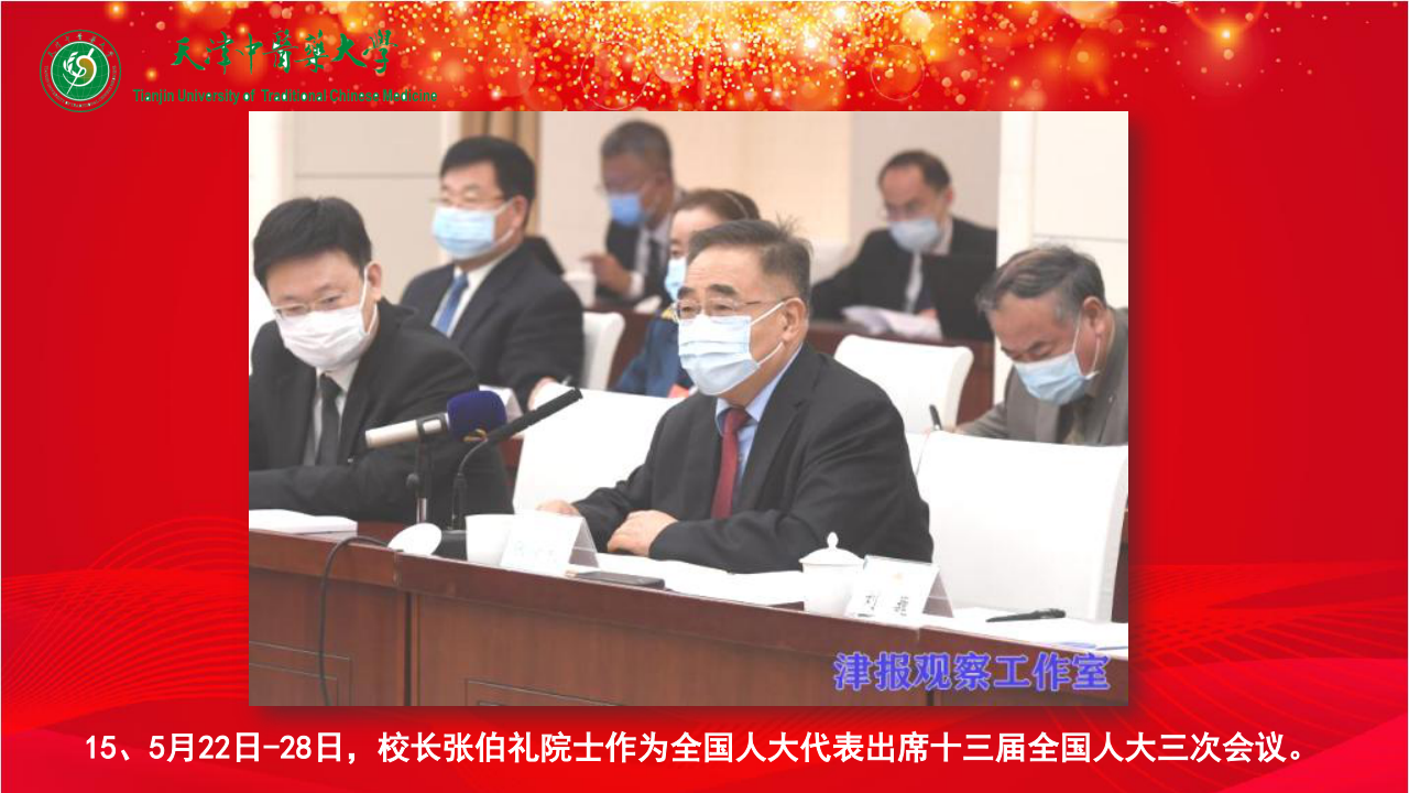 15、5月22日-28日,校长张伯礼院士作为全国人大代表出席十三届全国人大三次会议。