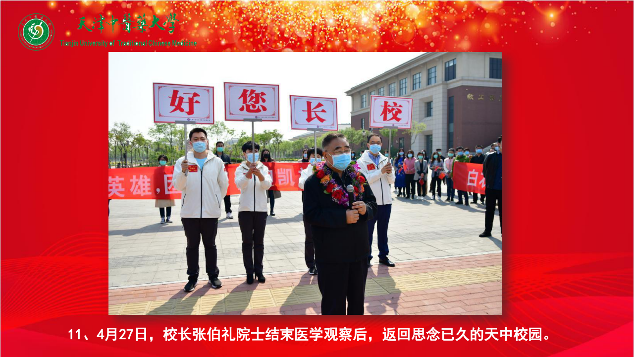11、4月27日,校长张伯礼院士结束医学观察后,返回思念已久的天中校园。