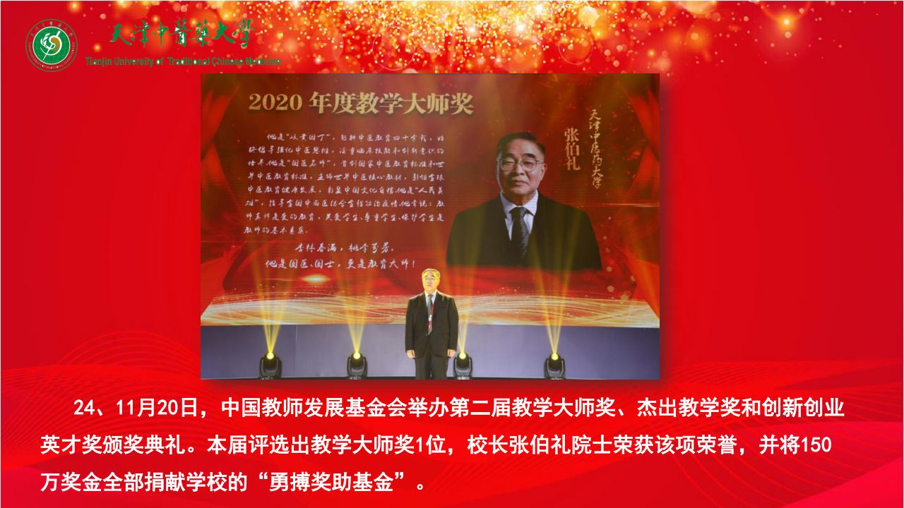24、11月20日,中国教师发展基金会举办第二届教学大师奖、杰出教学奖和创新创业英才奖颁奖典礼。本届评选出教学大师奖1位,校长张伯礼院士荣获该项荣誉,并将150万奖金全部捐献学校的“勇搏奖助基金”。