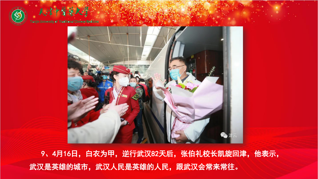 9、4月16日,白衣为甲,逆行武汉82天后,张伯礼校长凯旋回津,他表示,武汉是英雄的城市,武汉人民是英雄的人民,跟武汉会常来常往。