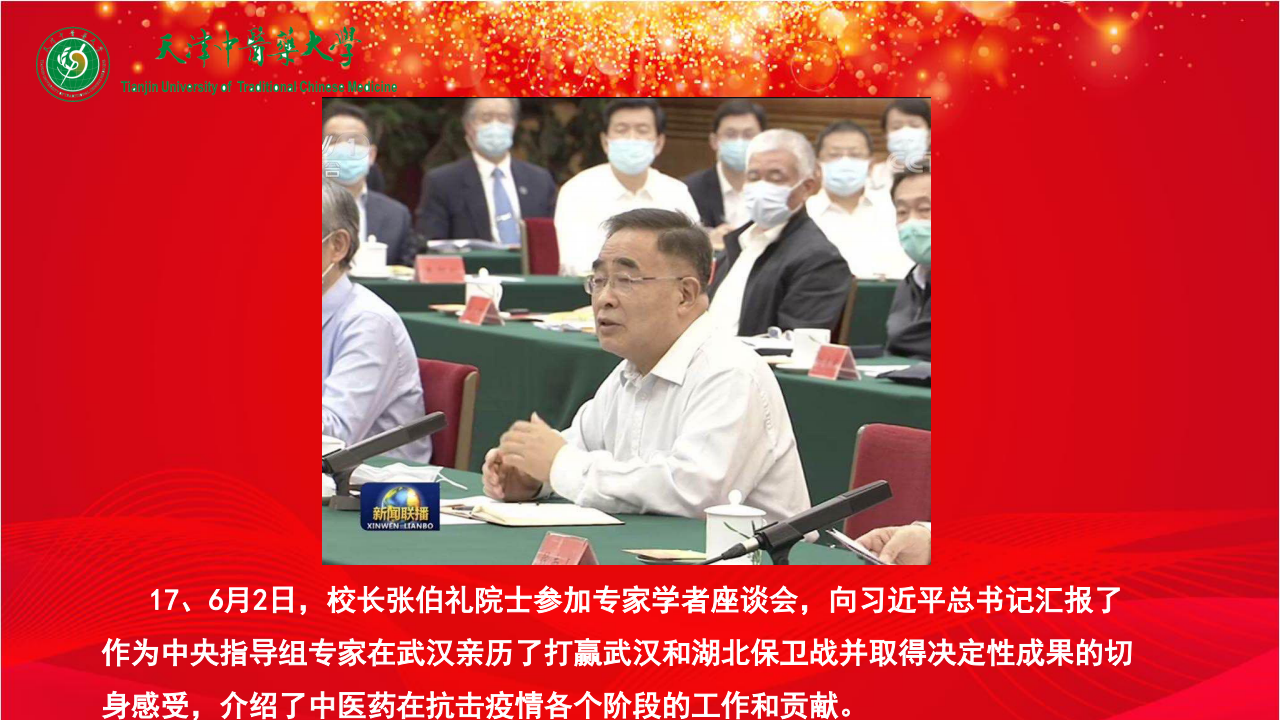 17、6月2日,校长张伯礼院士参加专家学者座谈会,向习近平总书记汇报了作为中央指导组专家在武汉亲历了打赢武汉和湖北保卫战并取得决定性成果的切身感受,介绍了中医药在抗击疫情各个阶段的工作和贡献。