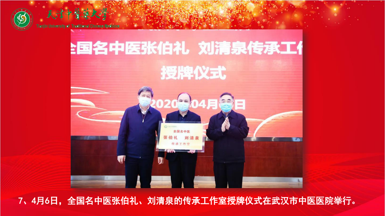 7、4月6日,全国名中医张伯礼、刘清泉的传承工作室授牌仪式在武汉市中医医院举行。