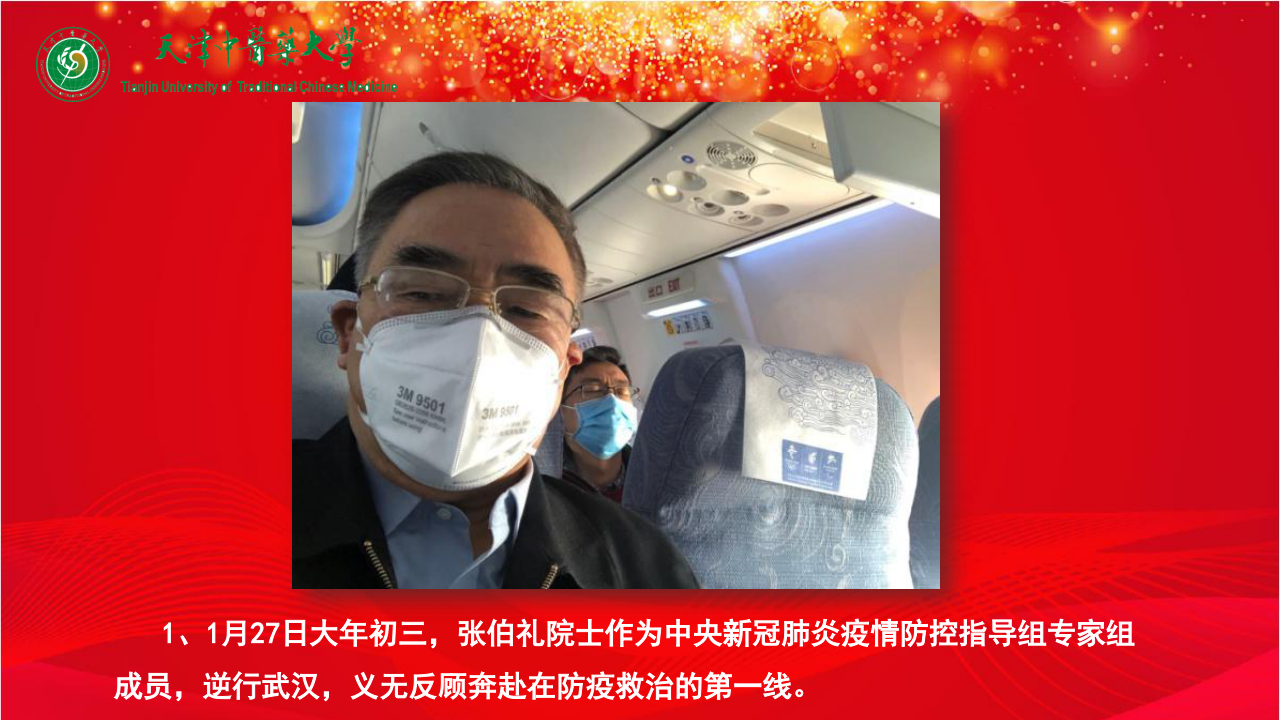 1、1月27日大年初三,张伯礼院士作为中央新冠肺炎疫情防控指导组专家组成员,逆行武汉,义无反顾奔赴在防疫救治的第一线。