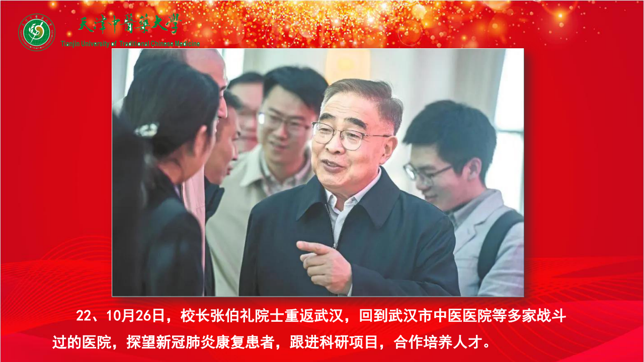 22、10月26日,校长张伯礼院士重返武汉,回到武汉市中医医院等多家战斗过的医院,探望新冠肺炎康复患者,跟进科研项目,合作培养人才。