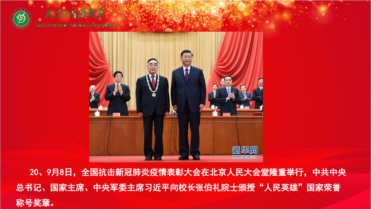 20、9月8日,全国抗击新冠肺炎疫情表彰大会在北京人民大会堂隆重举行,中共中央总书记、国家主席、中央军委主席习近平向校长张伯礼院士颁授“人民英雄”国家荣誉称号奖章。