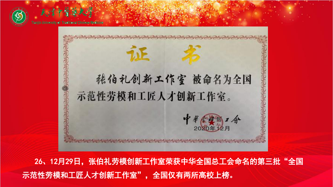 26、12月29日,张伯礼劳模创新工作室荣获中华全国总工会命名的第三批“全国示范性劳模和工匠人才创新工作室”,全国仅有两所高校上榜。