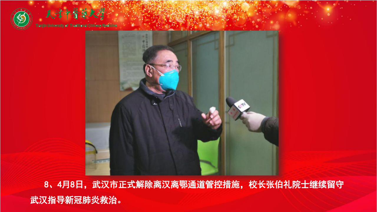 8、4月8日,武汉市正式解除离汉离鄂通道管控措施,校长张伯礼院士继续留守武汉指导新冠肺炎救治。