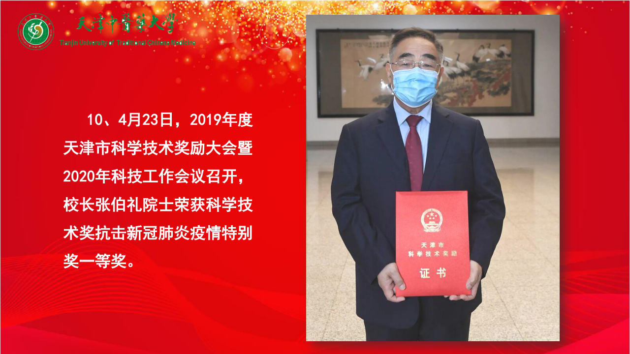 10、4月23日,2019年度天津市科学技术奖励大会暨2020年科技工作会议召开,校长张伯礼院士荣获科学技术奖抗击新冠肺炎疫情特别奖一等奖。