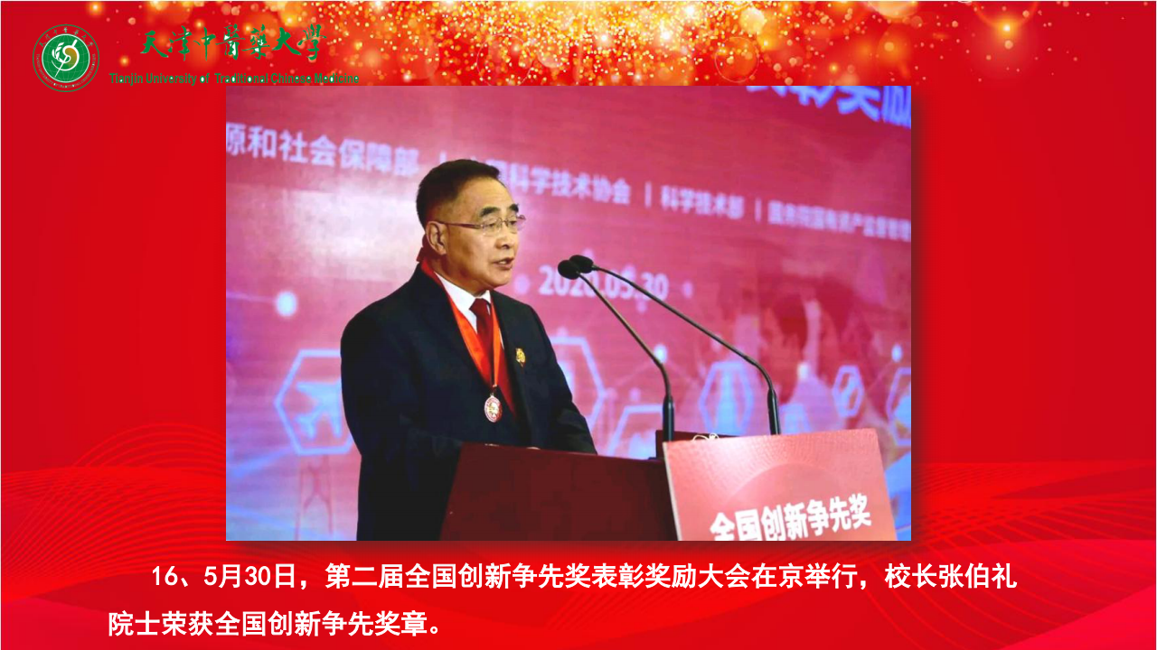 16、5月30日,第二届全国创新争先奖表彰奖励大会在京举行,校长张伯礼院士荣获全国创新争先奖章。