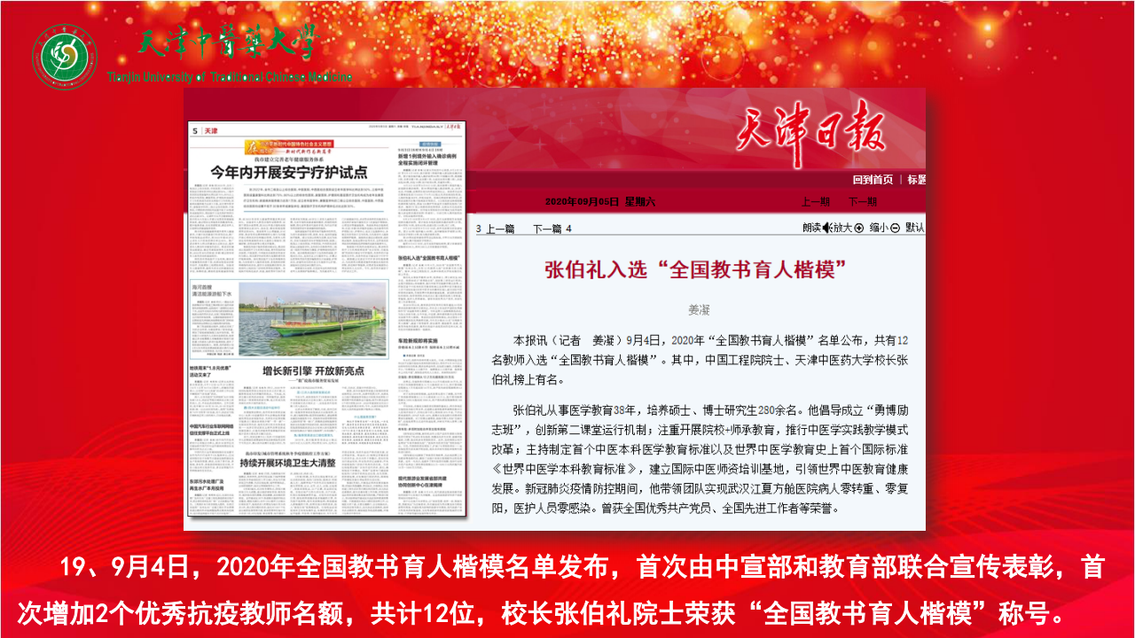 19、9月4日,2020年全国教书育人楷模名单发布,首次由中宣部和教育部联合宣传表彰,首次增加2个优秀抗疫教师名额,共计12位,校长张伯礼院士荣获“全国教书育人楷模”称号。