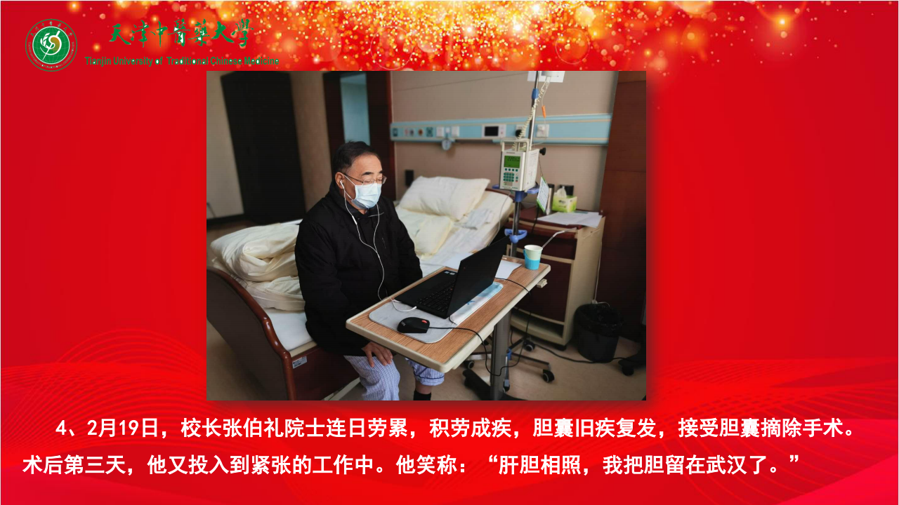 4、2月19日,校长张伯礼院士连日劳累,积劳成疾,胆囊旧疾复发,接受胆囊摘除手术。术后第三天,他又投入到紧张的工作中。他笑称:“肝胆相照,我把胆留在武汉了。”