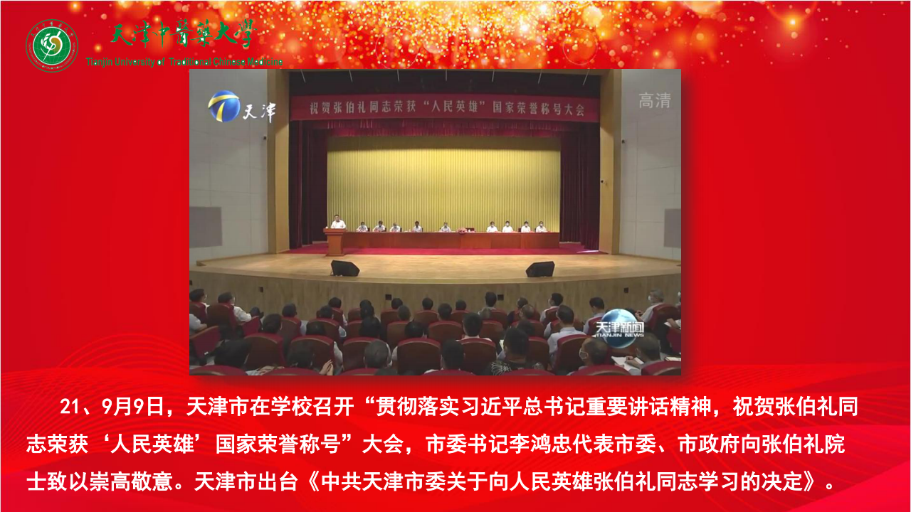 21、9月9日,天津市在学校召开“贯彻落实习近平总书记重要讲话精神,祝贺张伯礼同志荣获‘人民英雄’国家荣誉称号”大会,市委书记李鸿忠代表市委、市政府向张伯礼院士致以崇高敬意。天津市出台《中共天津市委关于向人民英雄张伯礼同志学习的决定》。
