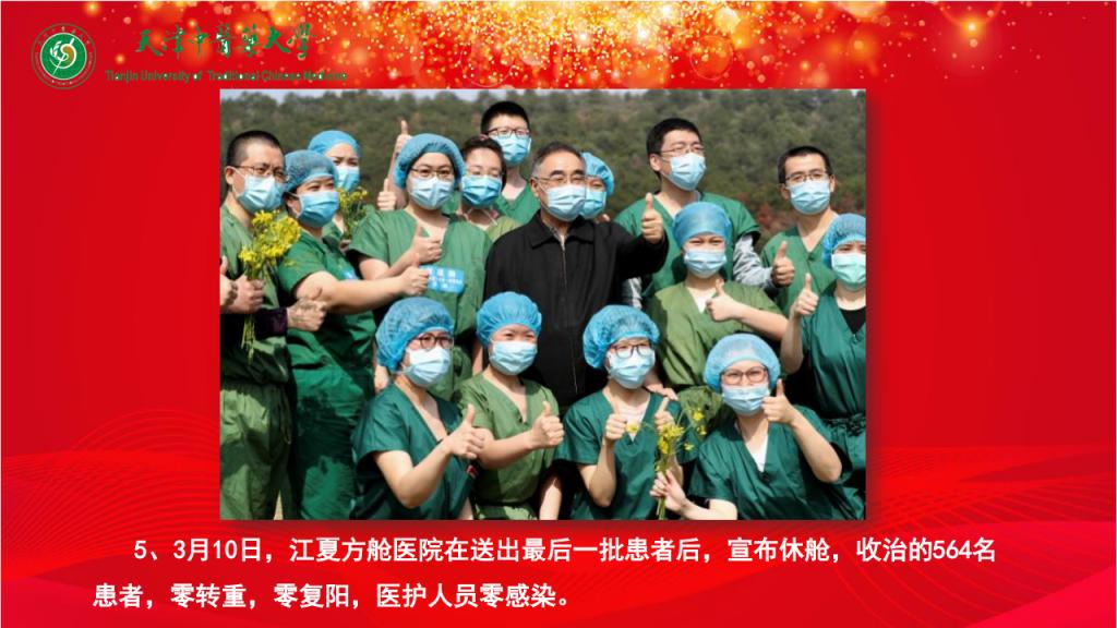 5、3月10日,江夏方舱医院在送出最后一批患者后,宣布休舱,收治的564名患者,零转重,零复阳,医护人员零感染。