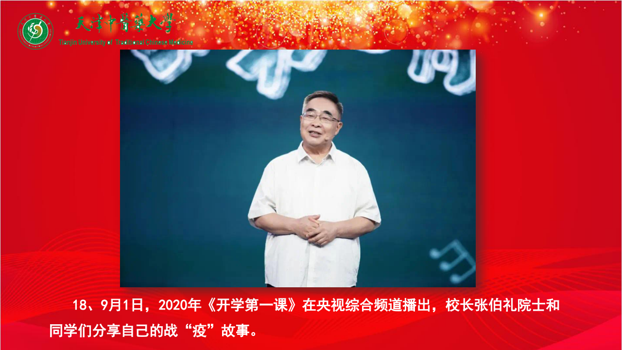 18、9月1日,2020年《开学第一课》在央视综合频道播出,校长张伯礼院士和同学们分享自己的战“疫”故事。