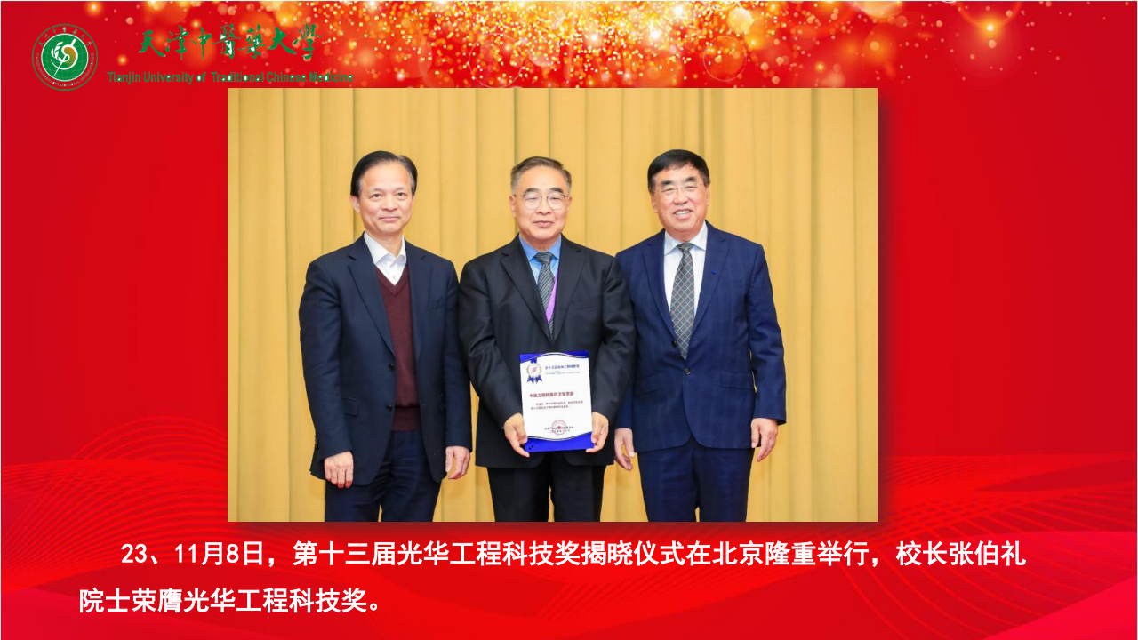 23、11月8日,第十三届光华工程科技奖揭晓仪式在北京隆重举行,校长张伯礼院士荣膺光华工程科技奖。
