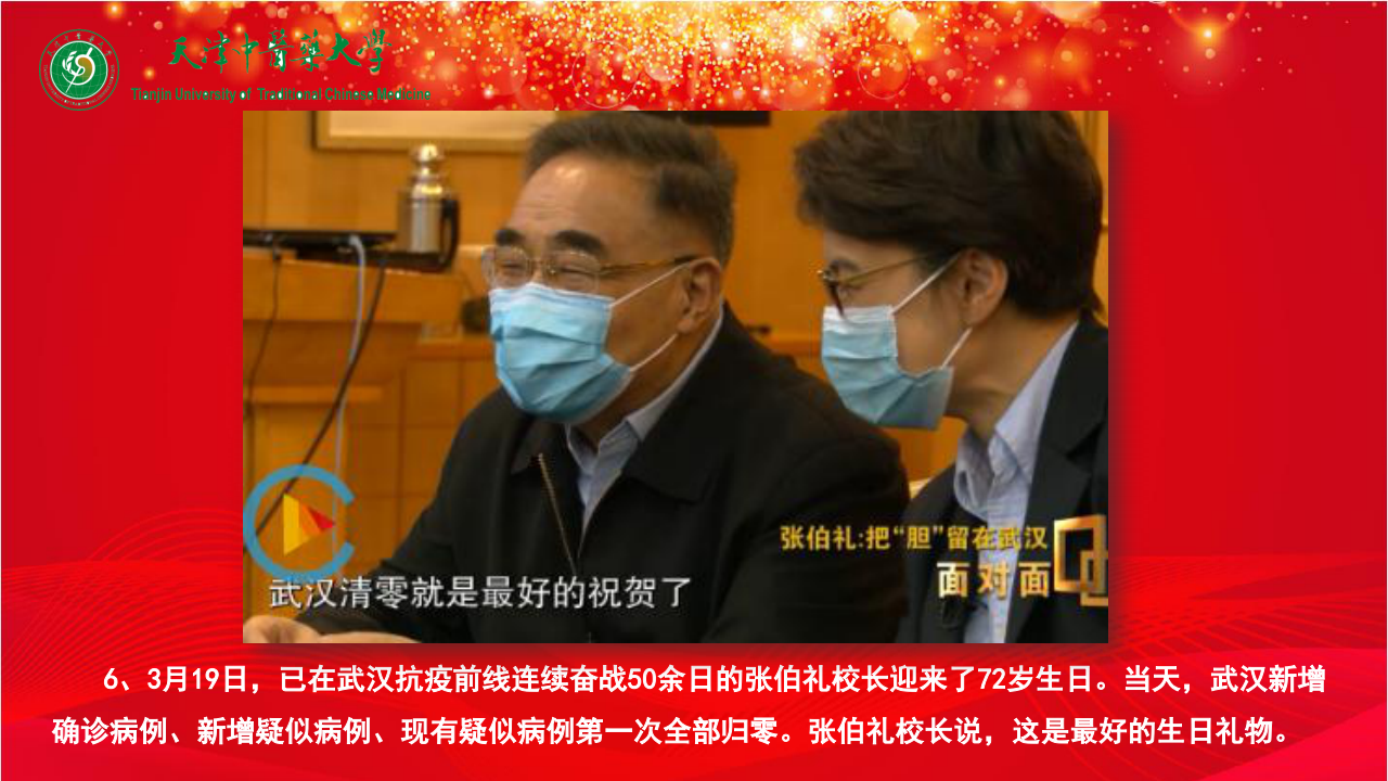 6、3月19日,已在武汉抗疫前线连续奋战50余日的张伯礼校长迎来了72岁生日。当天,武汉新增确诊病例、新增疑似病例、现有疑似病例第一次全部归零。张伯礼校长说,这是最好的生日礼物。