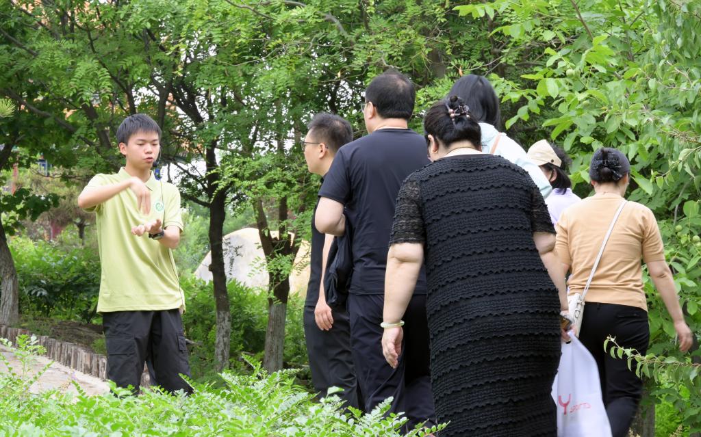 活动当天,四十组教职工家庭齐聚药山。在“如意药岭讲解团”学生讲解员的带领下,孩子们穿梭于郁郁葱葱的药材种植区,目光被一株株形态各异的植物吸引。讲解员结合端午传统习俗,介绍了艾蒿、佩兰、白芷等中药材的辨识要点与药用价值。孩子们还学习了连翘果实饱满,是清热解毒的良药;杜仲树皮粗糙、折断后可见银白色胶丝,有强筋健骨之效。孩子们边听边记,踊跃提问,在触摸叶片、观察花果的过程中,对中医药文化产生了浓厚兴趣。